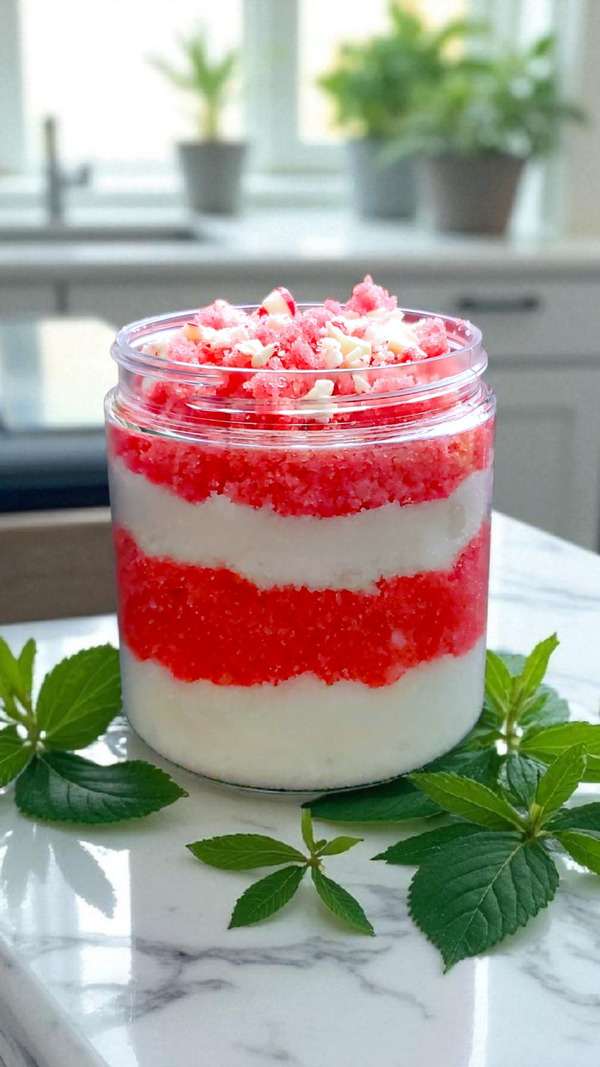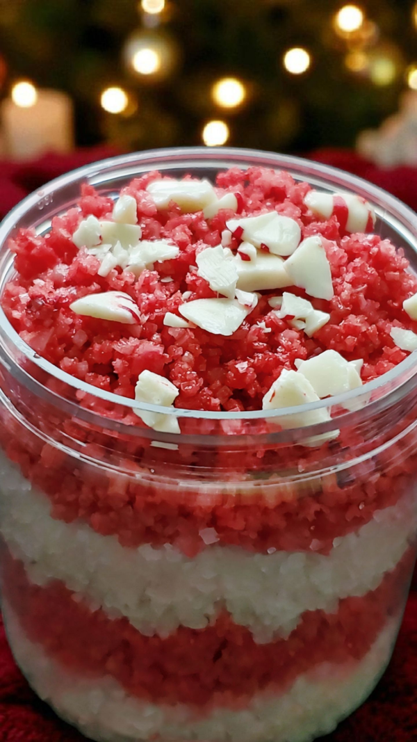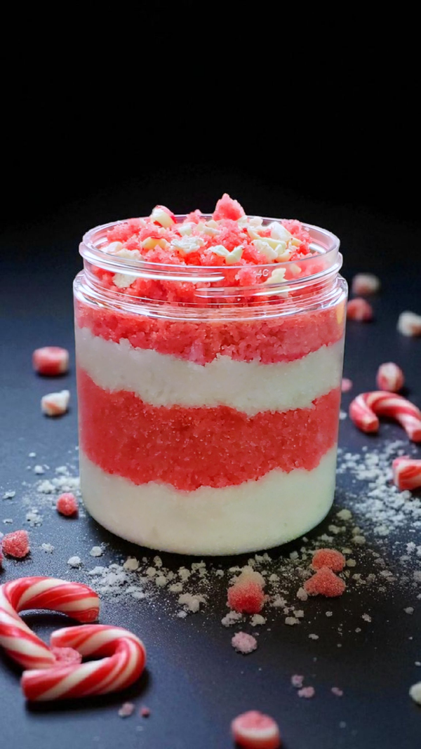 Visually stunning with a festive two-tone swirl of shimmering red and white vegan mica powder — all skin-safe and full of sparkle — and real bits of crushed Peppermint, this scrub is as beautiful as it is beneficial.