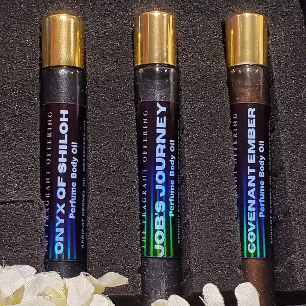 Discover your signature scent with The Fragrant Offering’s curated Three-Sample Perfume Body Oil Box — a perfect introduction to our Biblically inspired and divinely crafted fragrance collections. Choose any three scents from our Divine Collection or Biblically Themed Collection, each blended with premium essential oils, Jojoba, Grapeseed and Apricot Kernel oils, and a hint of ethically sourced vegan mica shimmer.