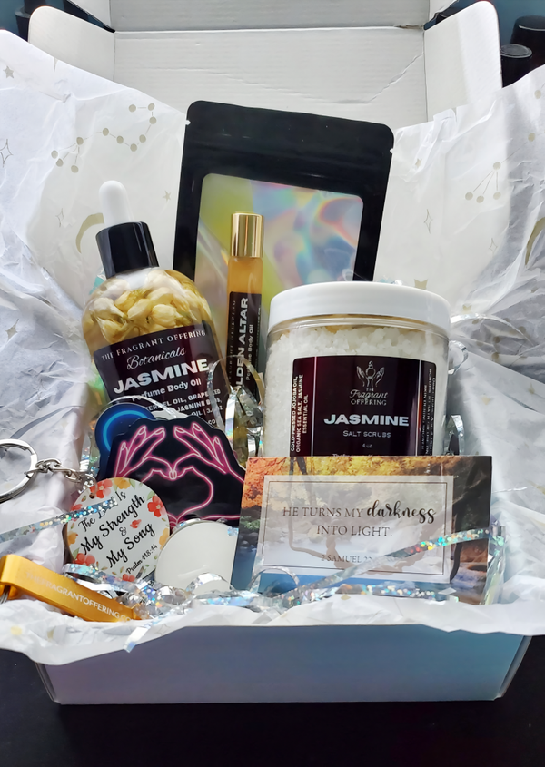 Every box comes with surprise free gifts — from uplifting scripture cards and charming keychains to a cozy tealight candle and fun stickers, and a box of a free 10 ml sample perfume oil from one of my two collections — making each unboxing a delight.