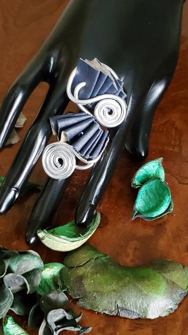 There's nothing better than a little leather, but make it a ring. This gorgeous sculpture ring is designed with non-tarnishing, 12-gauge aluminum wire, accented with genuine leather material, and formed into a truly one-of-a-kind piece of wearable art.
