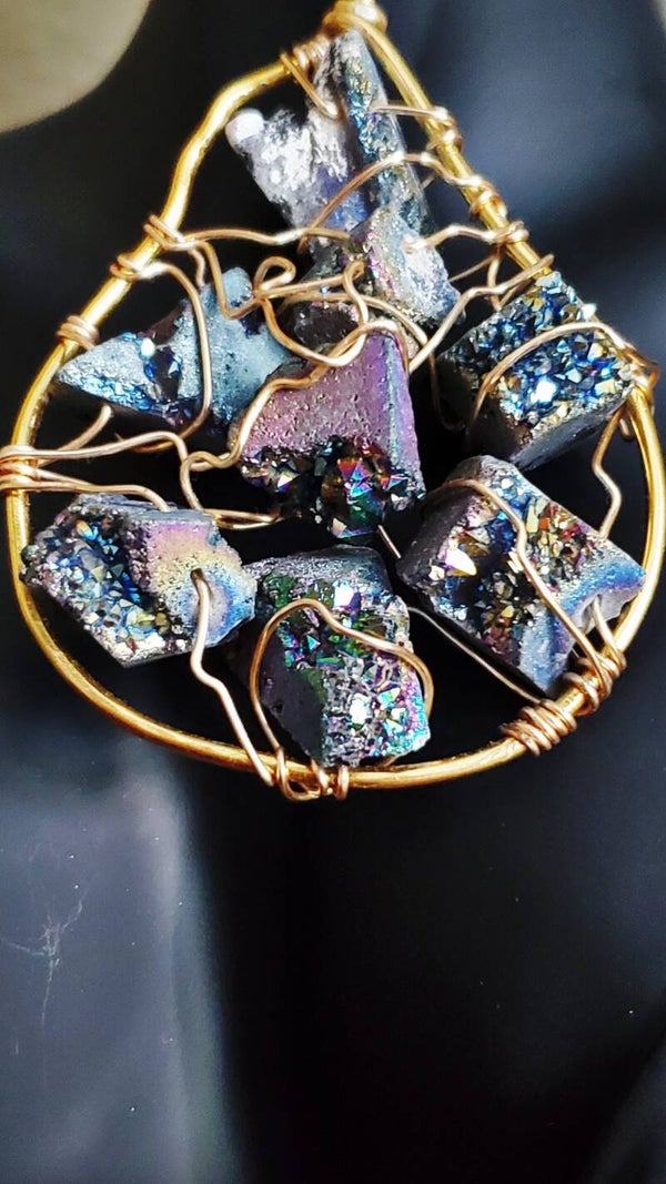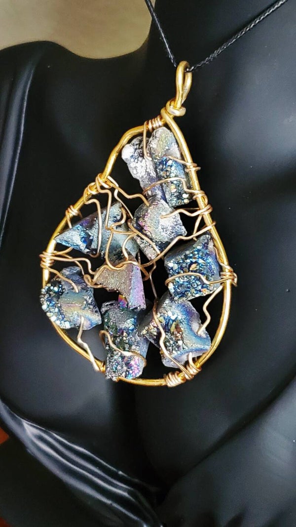 This large, statement pendant shown is ready to ship! Made with beautiful, sparkling blue Ore stones, they are set on non-tarnishing, 12-gauge aluminum wire frame using 20 gauge artistic wire in gold.