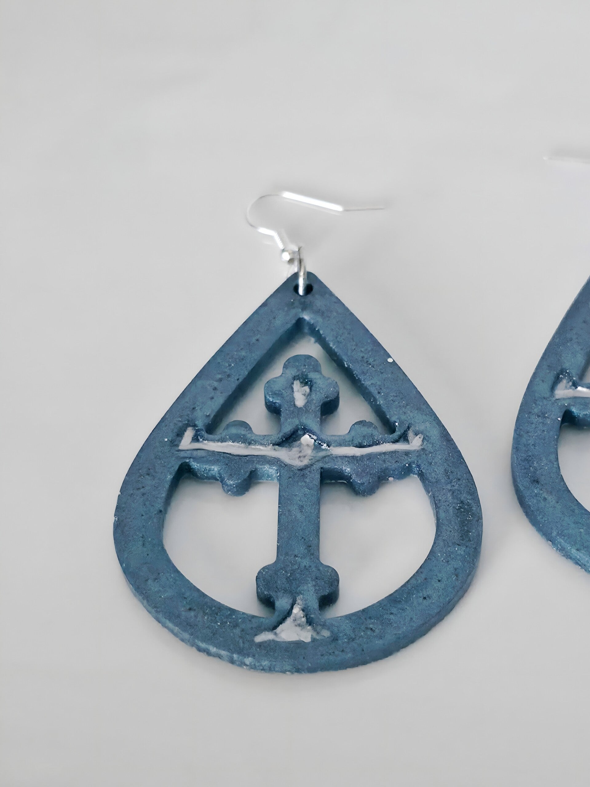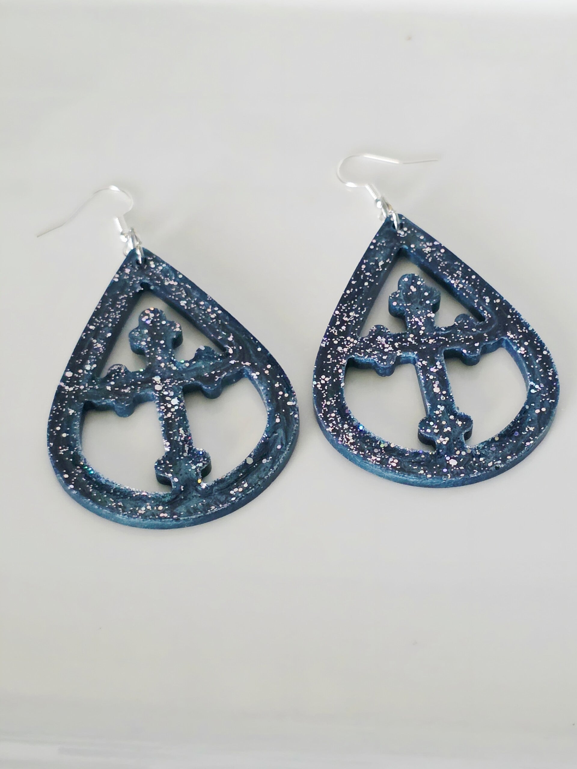 My Galaxy Teardrop Resin Cross Earrings are handcrafted using rich Spacewalk mica and sparkling silver glitter, creating a stunning celestial effect reminiscent of a starlit sky. The elegant teardrop frame cradles a cross at the center, symbolizing grace, protection, and divine covering.